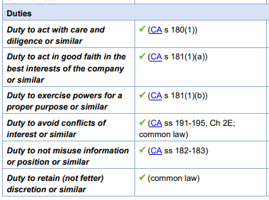 My ‘review case law on director’s duties and write a summary’ days are mercifully behind me, so please take these ticky boxes from a quite good law firm’s report to the Australian Institute of Company Directors as evidence that the duties exist. You may also wish to refer to these first year lecture notes I found.